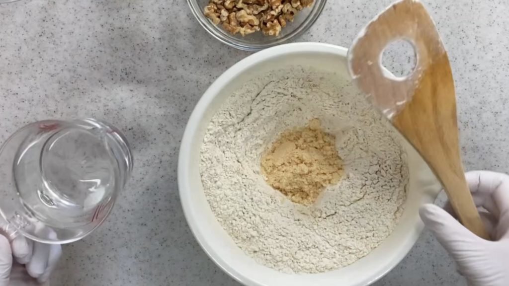 ■クルミは捏ねる時に初めから入れてしまうと捏ねにくくなってしまうので、バターがなじんでから入れるようにします。