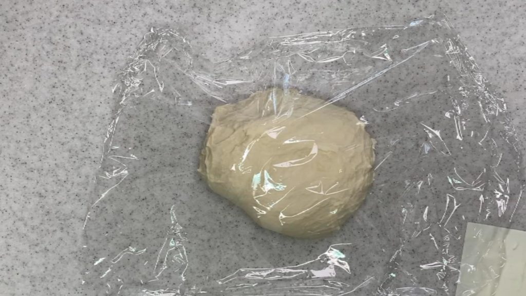 ④生地がひとかたまりになったら、ラップをして20分常温で置いておく。