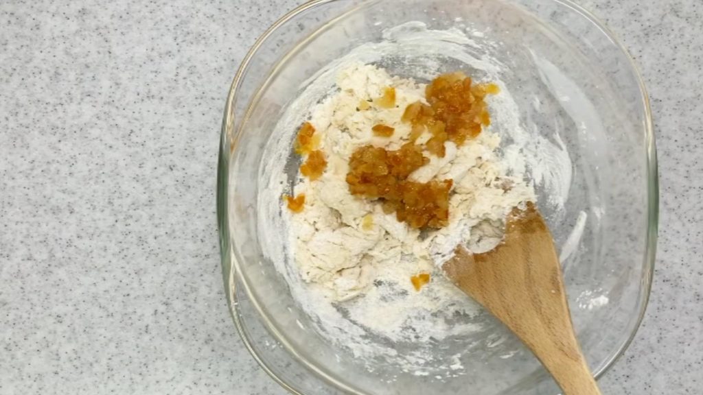 ③混ざったら(粉気が残っていてOK)オレンジピールを入れて混ぜる。